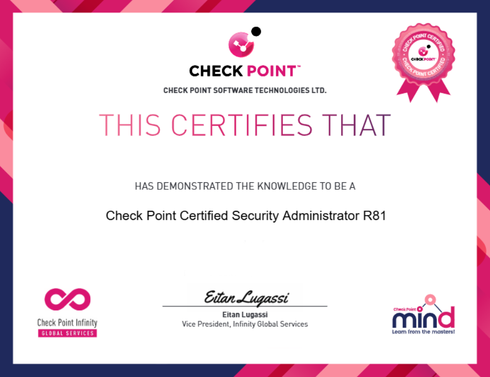 С гордостью сообщаем, что инженер нашей команды успешно прошёл международную сертификацию Check Point Certified Security Administrator (CCSA) R81. Это подтверждение его высокой квалификации в области настройки и администрирования решений сетевой безопасности Check Point.