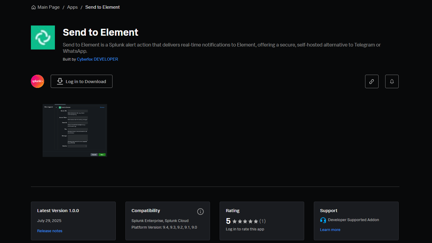 Именно поэтому команда CYBERFOX разработала Send to Element — открытое расширение для Splunk, позволяющее отправлять оповещения напрямую в Matrix (Element), без облаков, посредников и лишних зависимостей.
